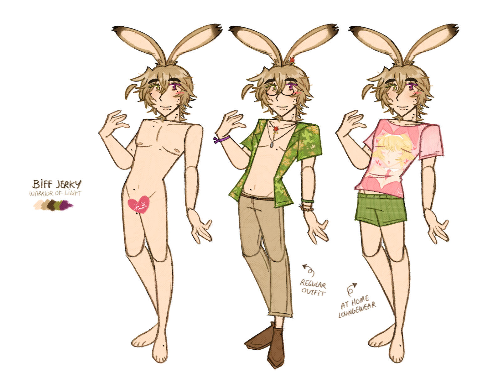 Biff is a silly guy that got isekai'd to his favorite MMORPG, Final Fantasy XIV Online. He forgot his name, but not his game tag "Biff Jerky", which became his new name.Prior to the events of FFXIV, he used to be salaryman that quit his job of a decade to become a NEET after saving up enough money. His days consisted of cup noodles, indulging in parasocialism with Vtubers and arguing on 2chan about best waifu— The bonafide definition of a pig otaku. Not soon after finally being freed from his corporate slave life, his life got turned upside down in ways he would've never imagined.When Biff first arrived in Eorzea, he couldn't process it was his new reality, and felt rather apathetic towards everything. He didn't care what happened, he simply wanted to get back home as soon as possible and resume his listless lifestyle.As time went on, he started to grasp the weight of being the Warrior of Light. With each new journey and every person het met, he changed bit by bit, becoming a more caring and overall kinder individual, to the point of feeling ashamed for who he was prior. Long gone are the days of yearning to go "home" as soon as possible, for Eorzea is now his new place to belong. However, this ardenous journey has also left him with a lot of trauma, physical and mental scars and other conflicted feelings he's refusing to acknowledge for the most part. Sometimes his inner turmoil slips through the cracks, leading to more reckless behaviour in combat or moments where he seems to be deep in thought and disconnected. He's quick to shrug it off with a wry smile, though.