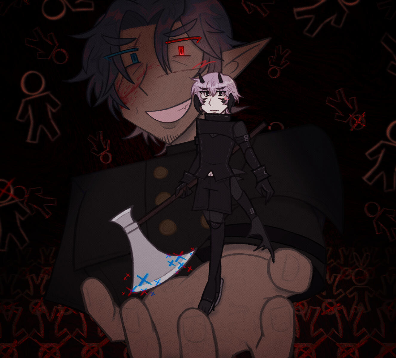 Bau was born in the Guette tribe, a secretive collective deep in the mountains surrounding the Azim Steppe. The tribe had been long plagued by illness, making it difficult to function as a proper one. They believed this was a 'curse' from the outside world, and isolated themselves as a result. Their ancestors have tried multiple unconventional ways to find a cure and increase their health, but after generations and generations of trial and error, they simply have given up and started seeing it as a blessing to be on death's doorstep instead. With each generation, having a weak consitution prone to illness and surviving on the bare minimum became the norm, while also still practicing abnormal traditions.While Bau seemed to be no different at first, he was in surprising good health, making him more capable than the average tribe member. He'd often go outside of the village, bringing back all sorts of gifts back for his mother. They started small, such as edible berries and flowers, and then it turned into animals he hunted on his own. His mother, who was the matriach of the clan, saw it as a sign of salvation and a blessing for the tribe. This lead to him being assigned the position of provider at an extremely young age. With all the energy he could muster mentally and physically, he carried the responsibility of hunting and foraging, ensuring the tribe had enough resources.While Bau had gotten no choice from his mother in being the provider for the tribe, he did as told because he loved his mother. When this role was shoved onto him at first, he was upset that he had to bring "gifts" for the whole tribe now. But, he could see that it made his mother happy, so he accepted it even if he didn't want to. The way she would beam with delight whenever he got enough "gifts" for the tribe are some of his fondest childhood memories.As he grew older, there were less words of praise and more physical punishment from his mother. No matter how much Bau brought back to the tribe, or no matter what he did, he could not escape the abuse coming his way. The feelings of love he once held for his mother turned completely dull. Bau continued to do as told, but didn't care about putting in any effort anymore. If there were any consequences, he'd simply accept since it had become the mundane for him. The memory of his mother's smile had become a long distant one by now. To find a moment of respite, Bau started going down the mountains more and to Reunion. Spending most of his time there listening to daily conversations of other tribes and passing travelers. He'd also start shirking his duties, opting to nap rather than going out to hunt and find resources. At times, he even found himself staying down the mountains for days at a time, yet he could never stay away for too long and always returned. While the hatred was swelling up within him, disobeying his own mother was still a hard choice to make.He once ran into a peculiar man with pointed ears and scars across his face at Reunion who was exploring the Azim Steppe. The man was curious about the different tribes and making different inquiries, and he ended up bothering Bau at some point. Said man misheard Bau speaking, calling him by "Baguette" instead. Every time the man returned at the Steppe, Bau would often be seen around him and listen to his stories of the outside world, growing more interested in about what was out there to see each time. Though, as much as Bau wanted to see the outside world, he knew wasn't allowed to make the decision to leave. Until the man told him that it's his life to live, and all he has to do is break the very metaphorical chains that bounded him. Having reached his limits, Bau listened to the man's advice and severed each chain one by one with his axe, setting himself free by never needing to return again. As a final "gift", Bau left his mother behind to rot in the mountains alongside the community she fostered, and finally was able to live a life of his own.Or that's how it was supposed to be like.Sudden rumors of a horrific "killer" started to spread across the land, leading to Bau to be paralyzed with fear of what might happen to him if it got revealed that he was behind it all. Unable to wash the blood of his own hands, he was backed into a corner— Until the very man who planted the idea of "freedom" in his head extended an invitation to become his new so-called travelling companion.Leaving the Steppe behind, he set out on his very first journey to the outside world.