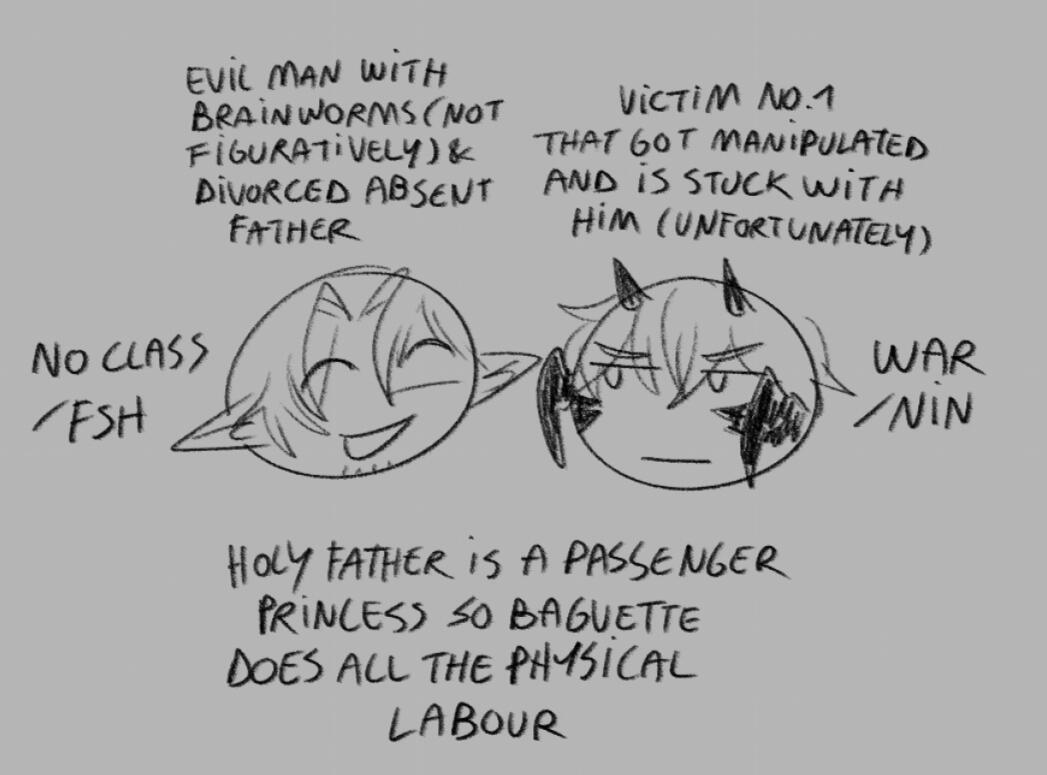 Holy Father is posessed by a voidsent in the shape of a worm, and a "worm". He's vaguely aware of the voidsents presence, but not the other. He's often hungry and craving for aether, and tends to get stomach issues when he doesn't consume enough aether. While he's gotten used to it, at first he believed it was because he ate too much sashimi one time, but that's because he confused it with symptoms of a tapeworm.